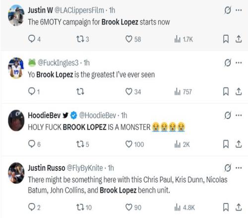 快船记者史蒂夫-琼斯写道:快船的第二阵容表现很不错,科林斯为保罗掩护,大洛去右侧蹲着拉开空间,等小萨去协防保罗后,保罗甩出来给大洛三分命中。