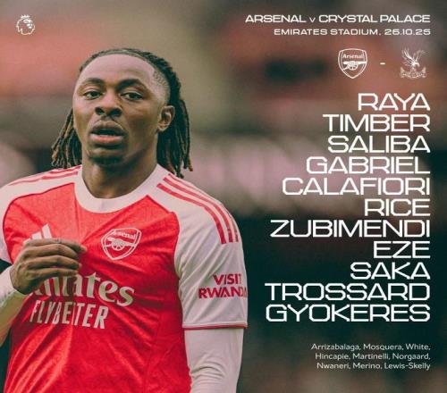 北京时间10月26日22:00,英超第9轮迎来一场伦敦德比战,阿森纳主场迎战水晶宫,赛前双方首发阵容陆续公布: