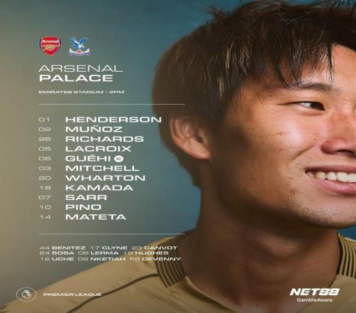 水晶宫首发:1-迪恩-亨德森、2-穆尼奥斯、26-克里斯-理查兹、5-拉克鲁瓦、6-格伊、3-米切尔、20-亚当-沃顿、18-镰田大地、7-伊斯梅拉-萨尔、10-耶雷米-皮诺、14-马特塔
