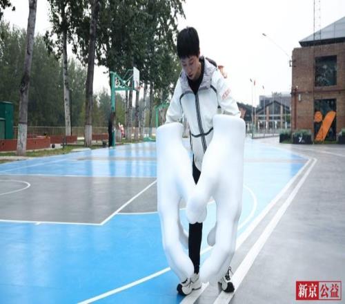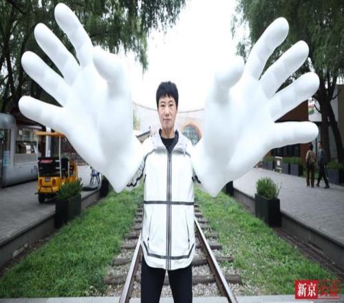 2025年10月22日,北京郎园,短道速滑奥运冠军张会戴上巨型手套,准备体验“淀粉人”的日常生活状态。