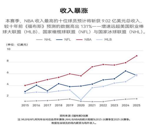 不过,库里并非唯一实现收入突破的NBA球星。本赛季收入前十球员的税前且未扣除经纪人佣金的总收入达9.02亿美元,较去年创纪录的7.87亿美元增长15%。