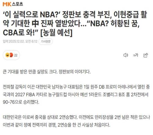 韩媒《MK体育》写道:就这水平还想打NBA?曾凡博世预赛发挥低迷,李贤重的表现出色让中国球迷愤怒,NBA是不切实际的梦想,曾凡博还是回CBA吧。
