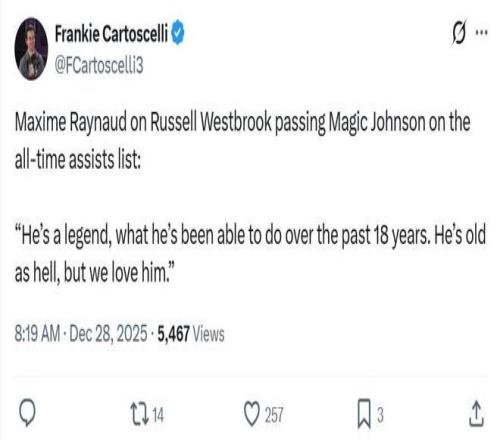其次是威少生涯总助攻数超越魔术师约翰逊独占NBA历史第七。