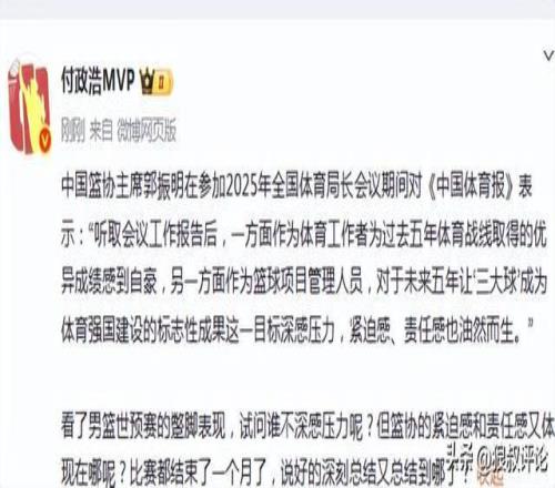 北京时间12月29日,中国篮协主席郭振明在参加2025年全国体育局长会议期间对《中国体育报》表示:“听取会议工作报告后,一方面作为体育工作者为过去五年体育战线取得的优异成绩感到自豪,另一方面作为篮球项目管理人员,对于未来五年让‘三大球’成为体育强国建设的标志性成果这一目标深感压力,紧迫感、责任感也油然而生。”