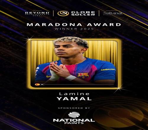 官方消息,巴塞罗那当家新星亚马尔荣获环球足球奖2025年马拉多纳奖。