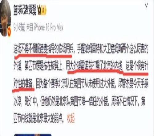 这场比赛可以说,张德贵太有谋略了,从教练角度讲他完胜许利民,贵叔用一个场均7分之人彻底打爆北京队,可见贵叔是用兵如神啊,在什么时候用什么人?贵叔想得和准备得都很周到。赛后北京篮球记者贾磊猛夸了老帅贵叔,表示不得不佩服张德贵指导,他说,“这场不得不佩服德贵指导的临场用兵,手握哈姆雷特和大卫詹姆斯两个这么厉害的外援,第四节愣是按在板凳上,用大外援雷诺兹打爆了北京的内线,这是个很有针对性的准备,因为整个赛季北京队在第四节从未使用过大外援。”没错,第四节内线就是北京最大的弱点,而张德贵指导却很好的抓住了北京队的弱点,进而逆转北京队。