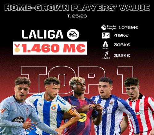 · 西甲联盟在青训人才价值与发展前景方面领跑欧洲,本土培养的球员总市场价值达14.6亿欧元,出场总时长占比19.8%,其可持续且极具竞争力的发展模式愈发稳固。· 西班牙足球发展